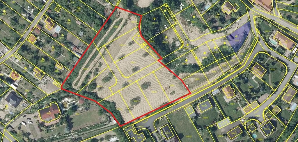 Pozemky tvoří soubor devíti pozemků a komunikace.