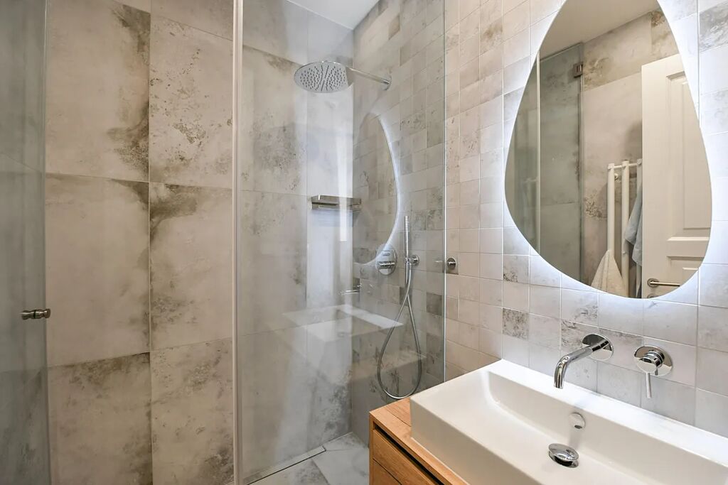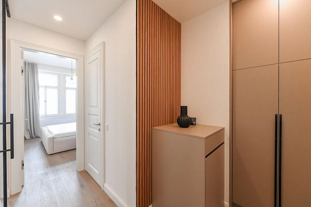 Interiér bytu je zařízený a dispozičně byt nabízí vstupní chodbu s vestavěnou šatní skříní (se zabudovanou pračkou/sušičkou 2v1), a se samostatným vstupem do místností: světlého obývacího pokoje spojeného s kuchyní vybavenou moderní kuchyňskou linkou včetně spotřebičů (lednice s mrazákem, varná deska, trouba, myčka, digestoř), ložnici s vestavěnou šatní skříní. Obě místnosti jsou vybavené klimatizací. Dále byt disponuje stylovou koupelnou s komfortně prostorným sprchovým koutem, a samostatnou toaletou. Součástí vybavení bytu tvoří: pračka/sušička 2v1, dřevěné dubové podlahy, nová okna s dvouvrstvým sklem. K bytu náleží sklep o velikosti 1,9m2, ke kterému se pohodlně dostanete výtahem.