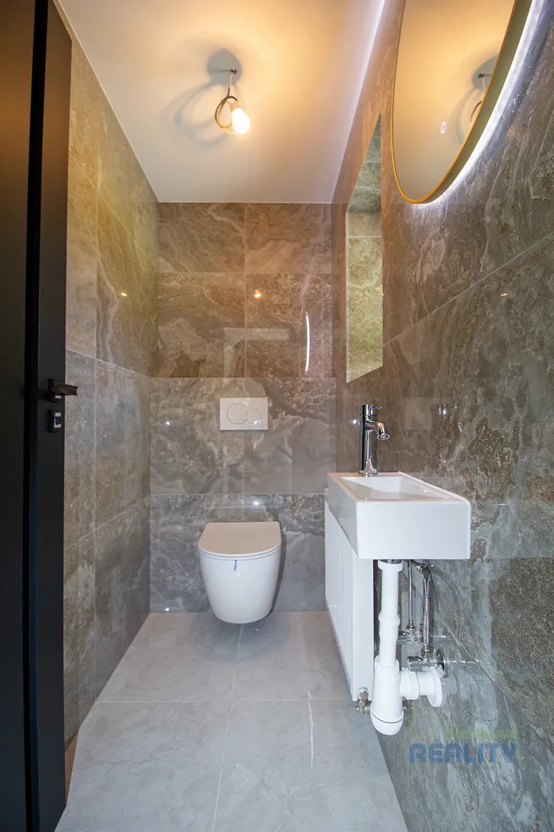 V přízemí se nachází prostorný obývací pokoj s jídelnou a kuchyňským koutem, ze kterého je vstup na terasou a zahradu. Dále zde najdete ložnici s vlastní koupelnou, samostatné WC, vstupní halu a technickou místnost.