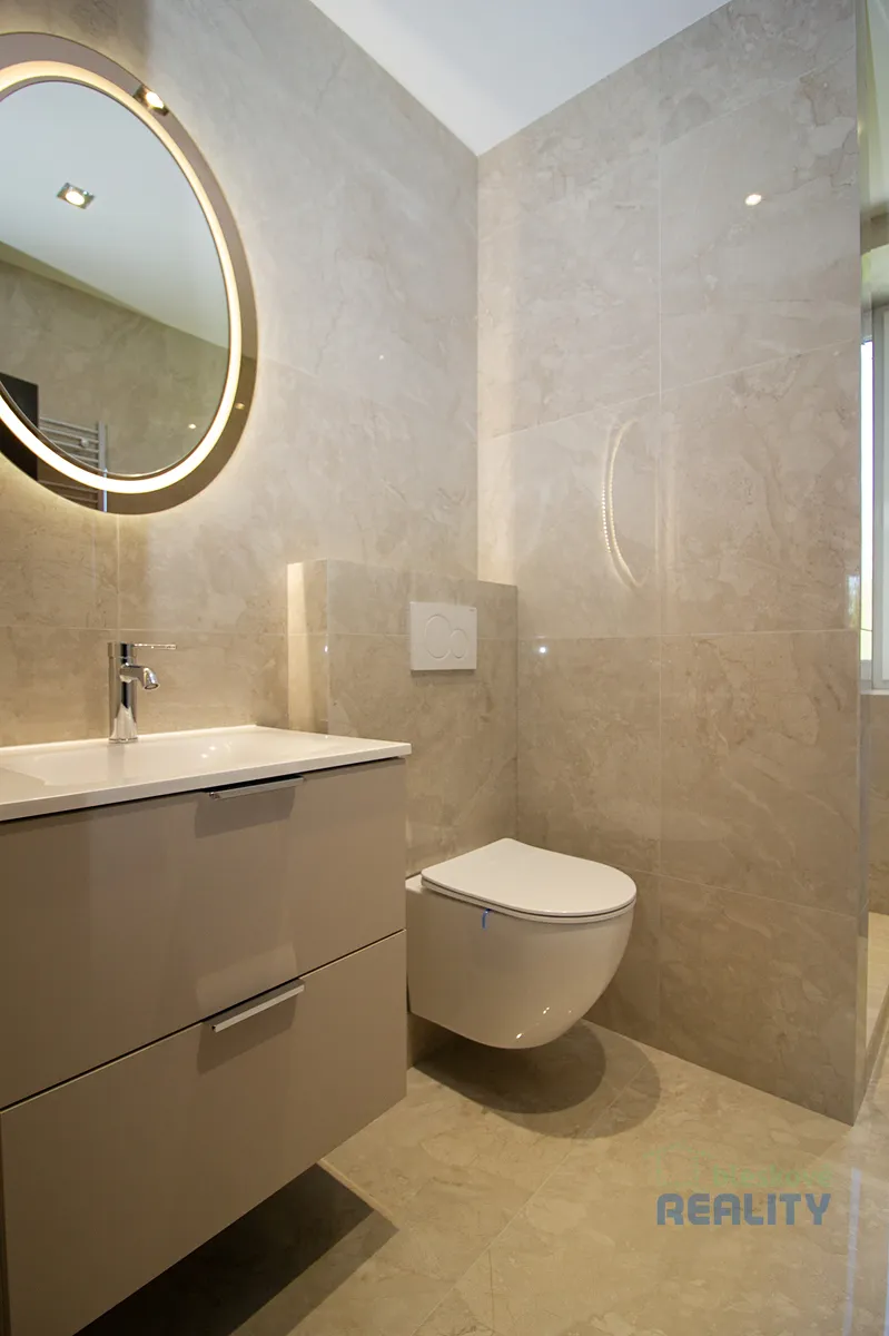 V patře jsou dvě velké ložnice s vlastní koupelnou (značkové vybavení Grohe), třetí pokoj vhodný jako pracovna či herna, společná koupelna, úklidová komora a otevřená galerie s velkými okny do zahrady – ideální pro odpočinek nebo klidnou práci.