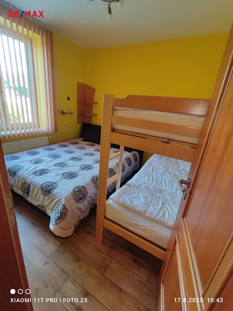Ve vstupní chodbě apartmánu je prostorná vestavěná skříň. Topení je řešeno samostatným plyn. kotlem do ústředního topení, který zajistí rychlé vytopení prostoru (není nutné temperovat). Nízké měsíční náklady apartmánu cca 600,-/měsíc (pojištění, úklid, elektř.spol.prostor, správa nemovitosti, fond oprav) + voda, plyn, elektřina. K apartmánu náleží pozemek s parkovacím místem o výměře 12 m2 a komora na patře bytu. Apartmán svými nízkými náklady a kvalitou vybavení je vhodný jako víkendový byt, nebo i výhodná investice – možnost pronajímání apartmánů jak turistům, tak i k trvalému bydlení.