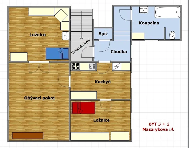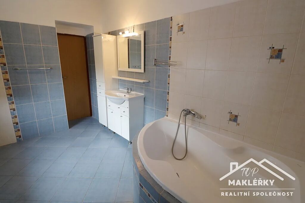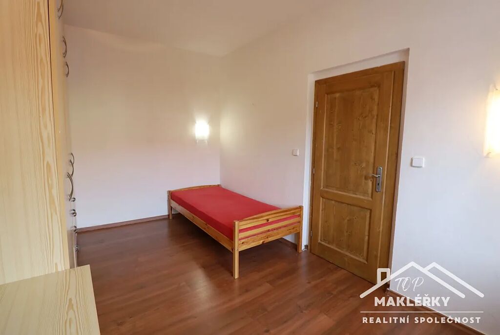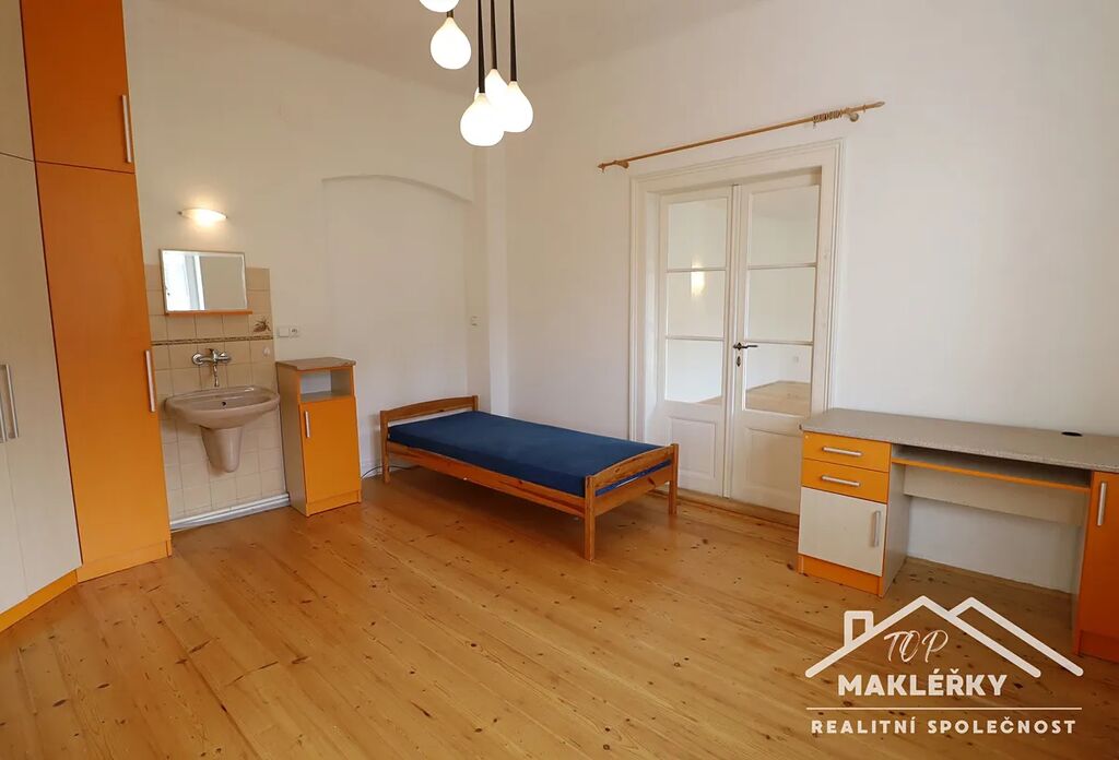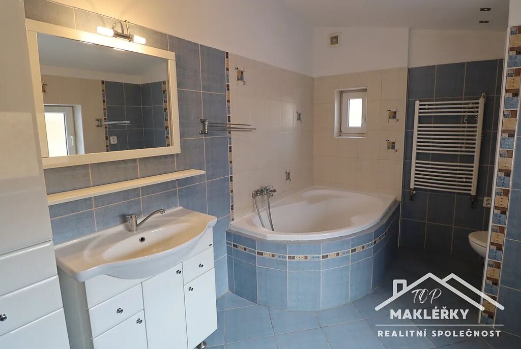 Nabízíme Vám pronájem bytu o výměře 84 m2 a dispozici 3+1, nacházejícím se v 1. patře bez výtahu v soukromém domě. Tento byt je v domě jediný, v přízemí se nachází kancelář. Dispozici bytu vidíte na přiloženém plánku, z chodby se vstupuje do kuchyně s jídelním koutem, vybavené plyn. varnou deskou. (Kuchyň není vybavena myčkou a lednicí). Přes kuchyň se chodí do jednoho z pokojů a do obývacího pokoje. V chodbě je spíž. Koupelna je vybavená vanou, umyvadlem, WC a místem na pračku. Do bytu se chodí vchodem ze dvora. Nájemníci bytu mají možnost za poplatek 1.200 Kč jako jediní využívat celou zahradu s pergolou, místem pro bazén, travnatou plochou o výměře 260 m2 a  garáž o velikosti 12 m2. Nájem činí 17.000 Kč/měs + 400 Kč/měs/osobu zálohu na vodu + elektřina a plyn se převádí na nájemníka (cca 5.000 za obojí) + volitelné 1.200 za zahradu a garáž.  Kauce je stanovena ve výši 2 měsíčních nájmů, provize RK 15.000 Kč. Domácí mazlíček nevadí.