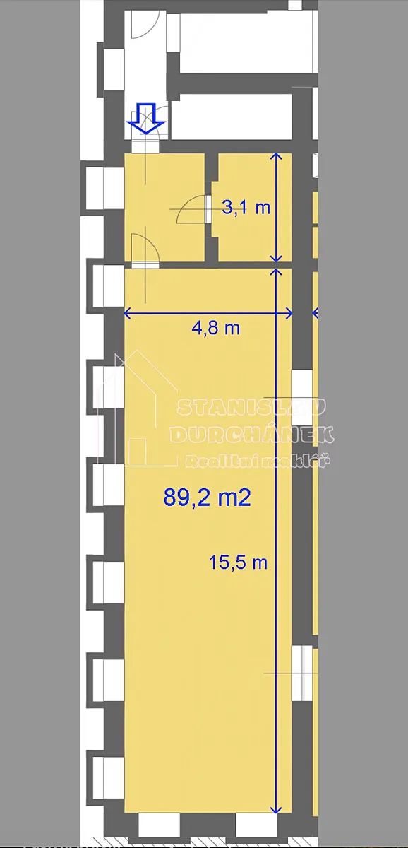 Prostor je členěn do 2 hlavních místností (přepažených oddělitelnou stěnou) + je k dispozici koupelna se sprchovým koutem, WC a umyvadlem a také vstupní chodba. Po dřívějších nájemnících zde zůstala sauna (pokud se Vám nehodí do konceptu podnikání, dohoda na odstranění možná). Možnost zapojení ventilace (pro přívod čerstvého vzduchu nebo odtah vzduchu).