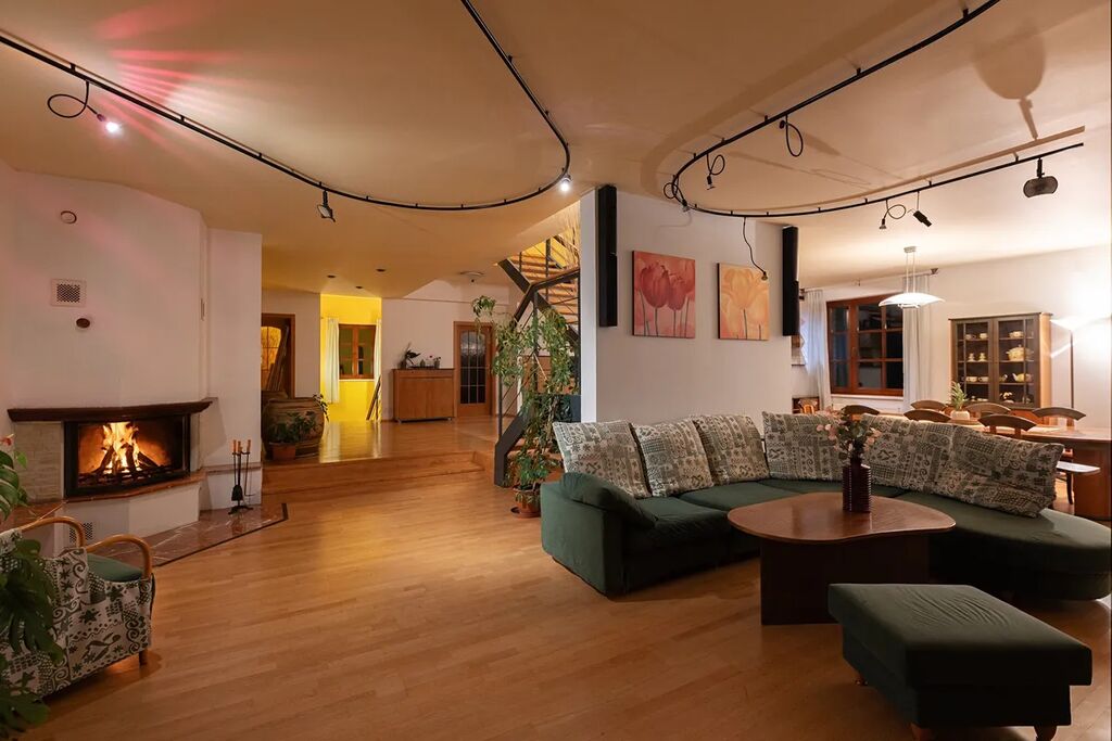 Obytnému prostoru vévodí skoro 120 metrový obývák s kuchyní, ve kterém nesmí chybět krb. Opticky lehké schodiště propojuje srdce domu s ložnicemi, které vás čekají 4 (velikosti 19 m2). Nahoře pak několik šaten, dvě koupelny. Rodiče fungují ve své samostatné zóně tak, aby nebyli rušení s provozem dětským pokojů. Však byla návrhu domu věnována náležitá pozornost, nejedná se o žádnou okopčenou vzorovku.