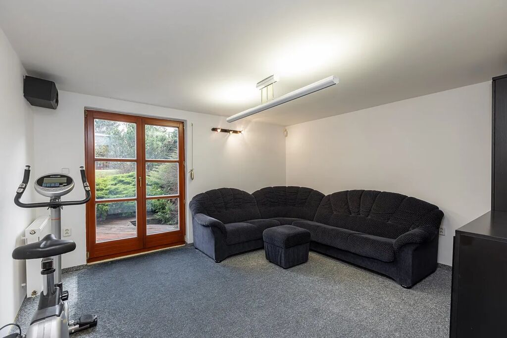 Prakticky smýšlející zaujme suterén, který funguje jako regulérní podlaží. Tedy nejen dílna, obrovská prádelna, úložné prostory a velká wellness zóna (sauna, vířivka, posilovna, 47 m2), ale také místnost pro pracovnu či pokoj pro hosty. Spoustu místa nabízí také velká a vysoká garáž, ve které lze umístit další patro (na stávající traverzy).
