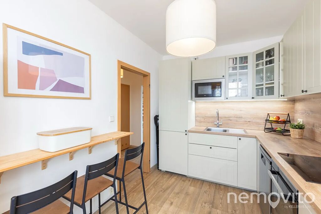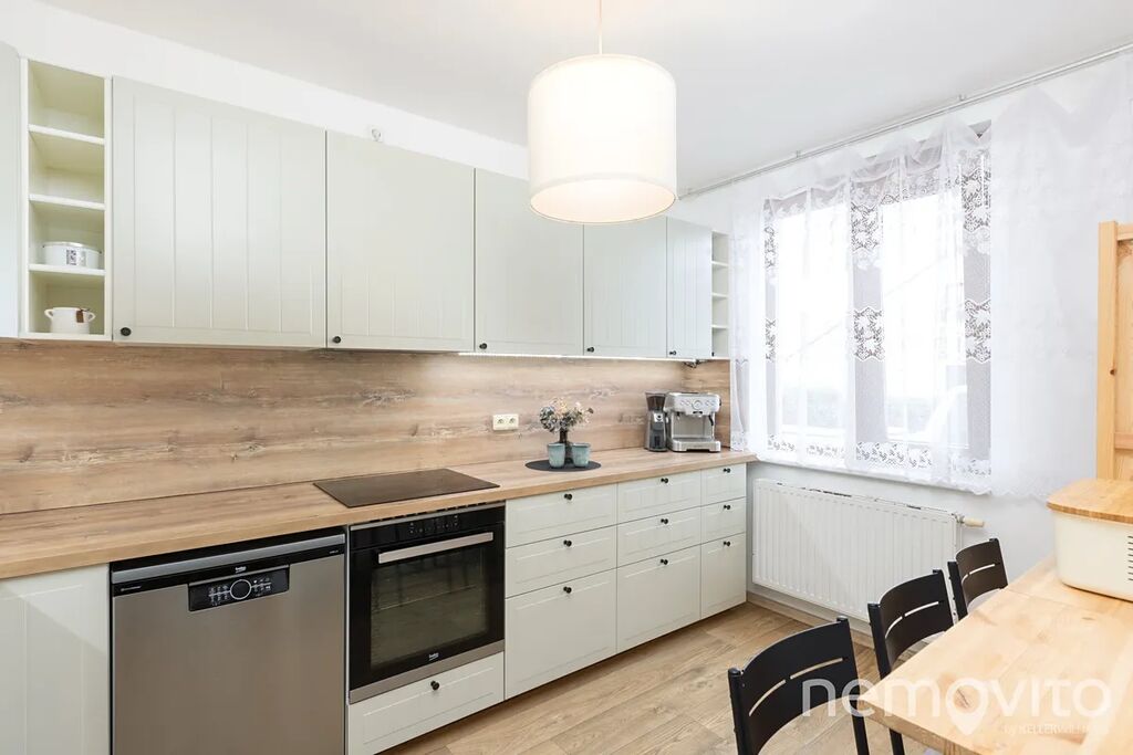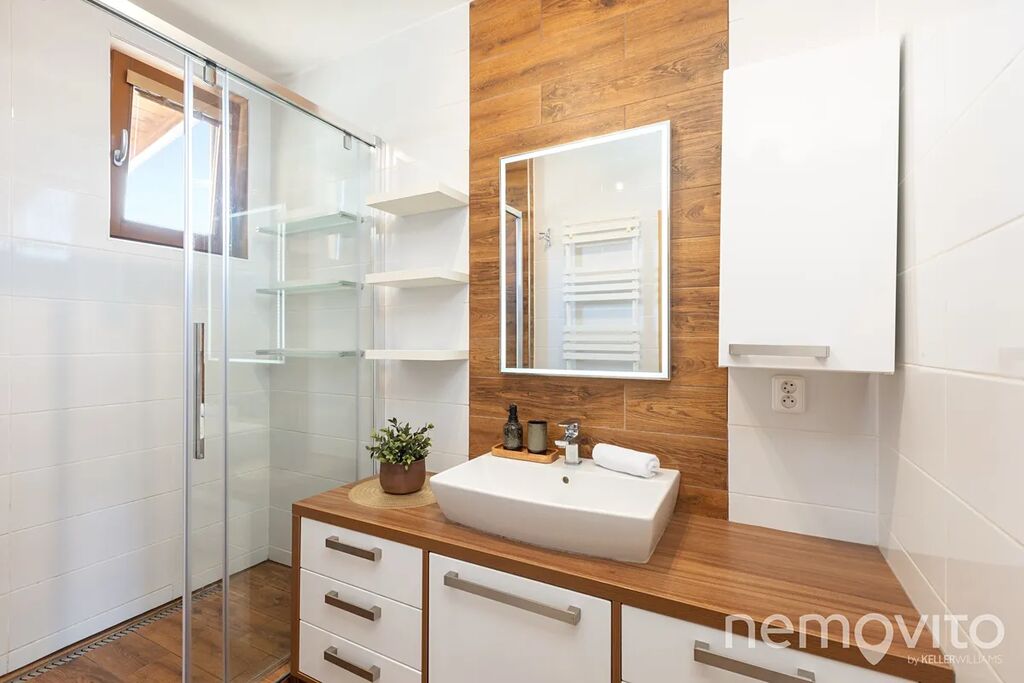 Vymezen je jako bytová jednotka v RD (celkem 3 jednotky) a dle prohlášení vlastníka má plochu 74 m2, díky úpravám podkroví je však plocha po přeměření 87 m2. Další z úprav pak byl přesun kuchyně do samostatné místnosti s oknem, díky čemuž je obývák (28 m2) skutečně prostorný. Vstup na zahradu je možný jak z obýváku, tak zezadu přes vrátka. Nová kuchyně (10 m2) s oknem je umístěna u vstupu směrem do ulice, naproti je pak samostatné WC a nová koupelna s velkým sprchovým koutem.