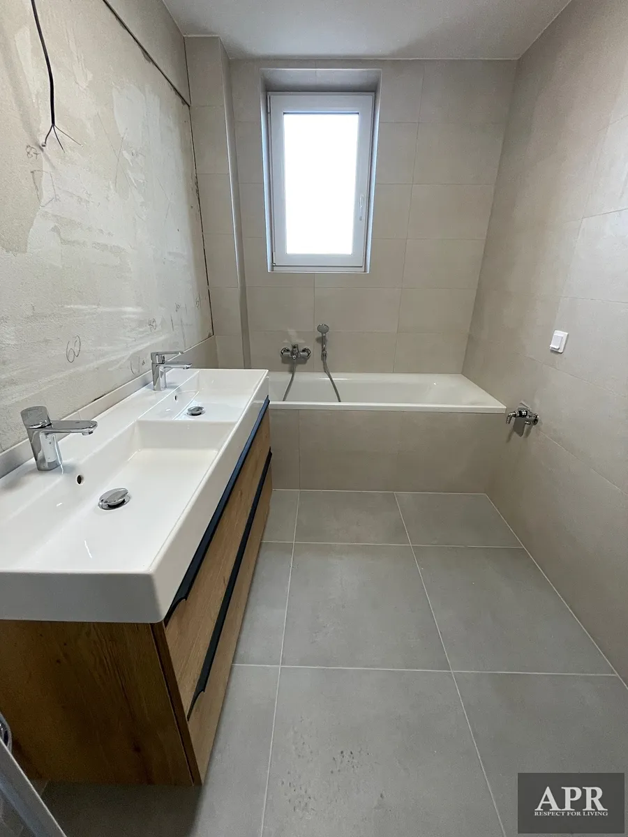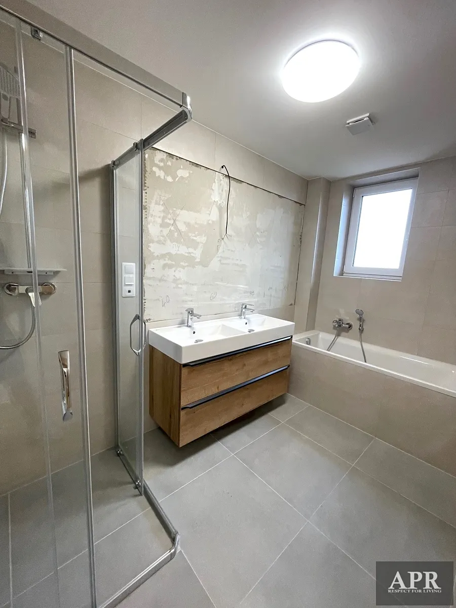 Kuchyňská linka vybavená vestavnými spotřebiči, v koupelně naleznete vanu i sprchový kout , WC je samostatné, k bytu patří i luxusní střešní terasa o výměře přes 43,35 m2, součástí jsou taky dvě šatny, technická místnost nebo šatna.