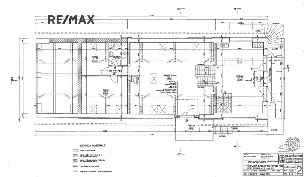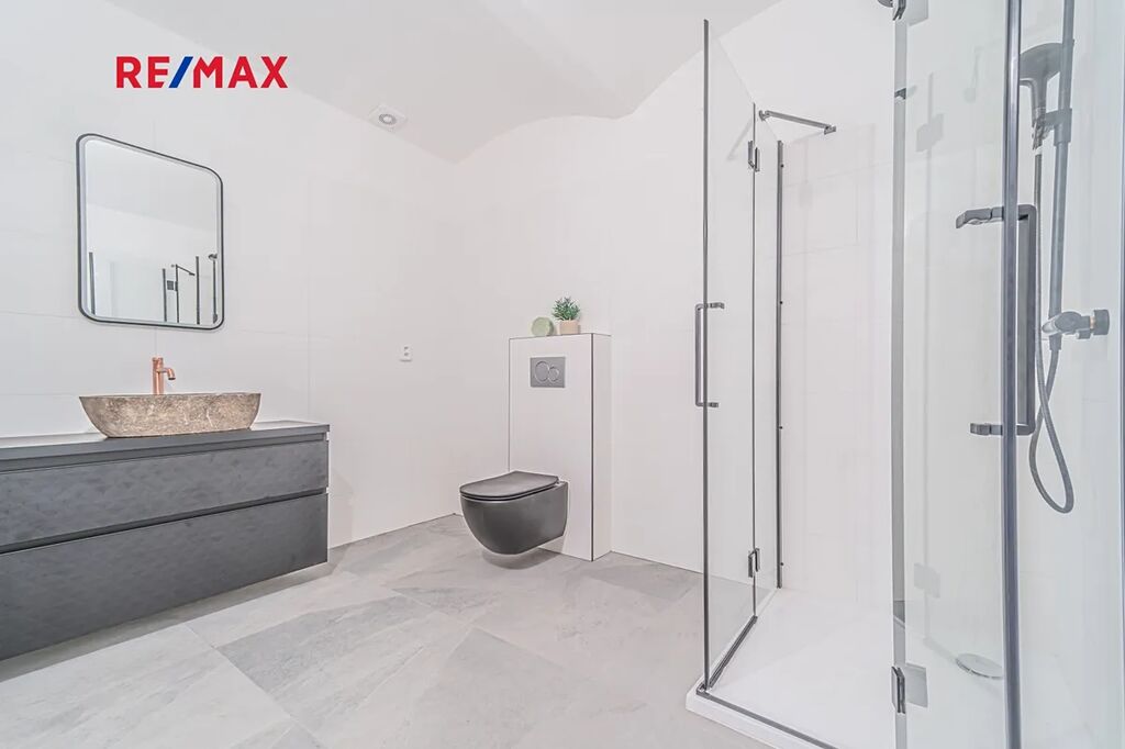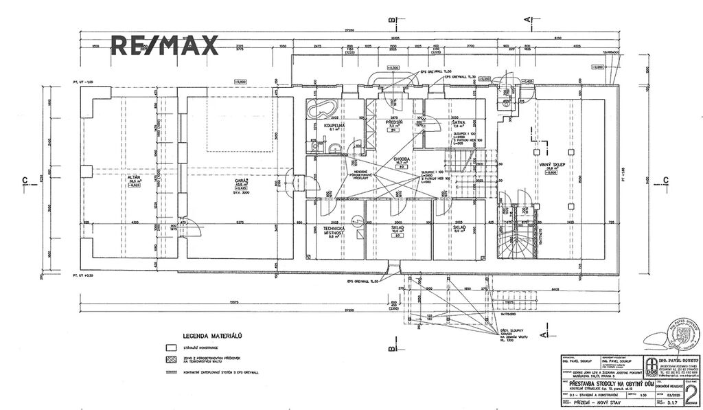Stavba prošla dílčí rekonstrukcí zahrnující výměnu střešní krytiny a zateplení střechy stříkanou pěnovou izolací, nové betonové podlahy, rozvody elektroinstalace, příprava koupelny, vyzdění nových příček. Stavba je ve fázi rekonstrukce a přestavby na obytnou budovu s obytnou plochou cca 217 m2 + garáž, altán a sklep. Plány znázorňují budoucí stav. Výhodou je prostorná garáž (44 m2) a přiléhající altán (38 m2), který lze užívat jako další prostor k parkování, dílna atp. či k venkovnímu krytému posezení. Okouzlí Vás i potenciál klenbového vinného sklepa z červených cihel (45 m2).
