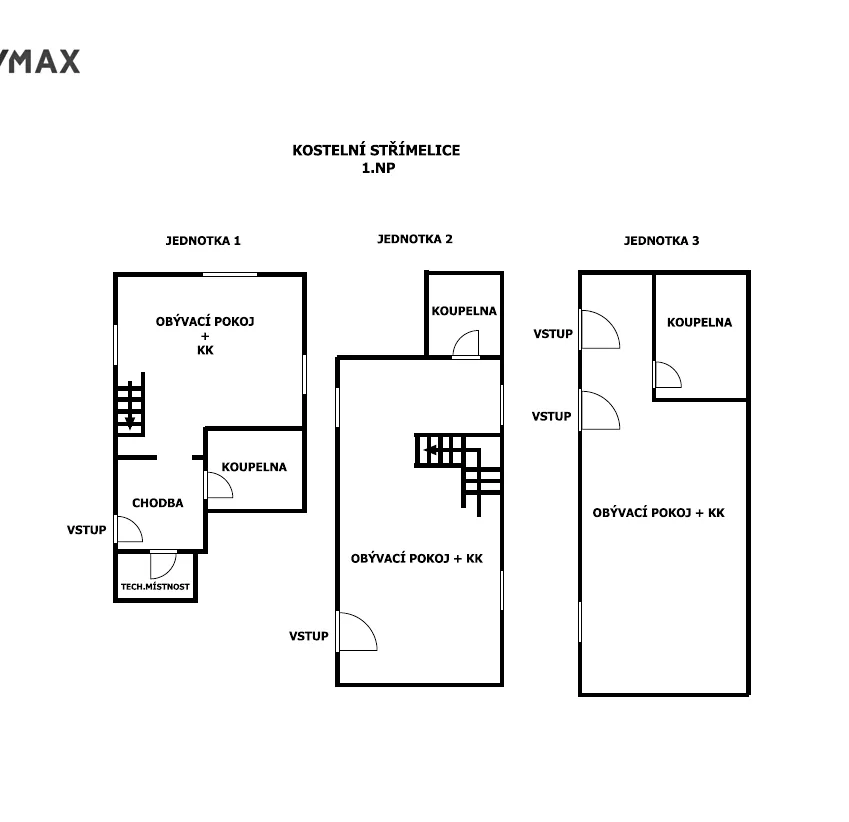 Tři samostatné jednotky 3+kk, 2+kk, 1+kk, možnost další půdní vestavby.