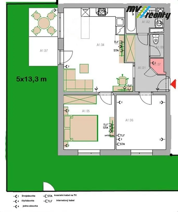 - kuchyňská linka včetně spotřebičů (myčka, lednice, mikrovlnná trouba, indukční deska, trouba), jídelní kout, tv stolek a poličky