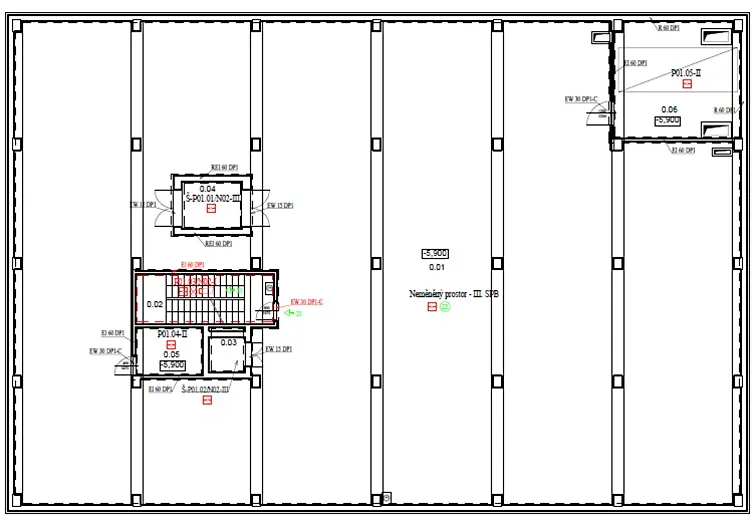 -technické a obslužné prostory (schodiště, výtah, strojovna VZT) 75 m2