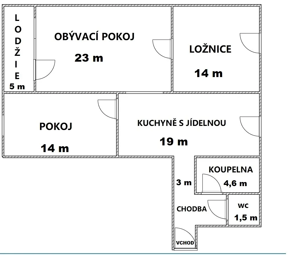 Užitná plocha bytu činí 80 m². Dispozice zahrnuje vstupní chodbu, kuchyni s jídelnou, koupelnu, samostatné WC a tři obytné místnosti. Z jídelny je vstup do pokoje nebo přes prosklené dveře vejdete do prostorného obývacího pokoje s lodžií o výměře 5 m². Ložnice je přístupná z obývacího pokoje.