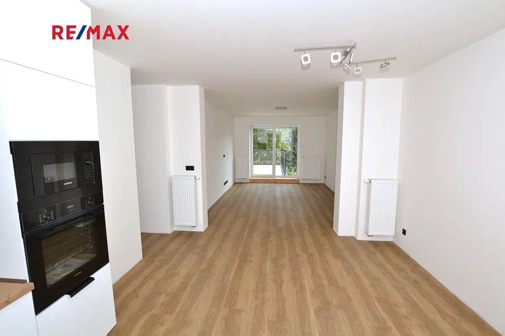 Byt čeká na svého prvního nájemce. Okna dvou pokojů a kuchyňského koutu jsou orientována na západní stranu, okna obývacího pokoje a ložnice s terasou na východní stranu do zahrady se vzrostlými stromy, kterou nájemce může využívat k relaxaci.