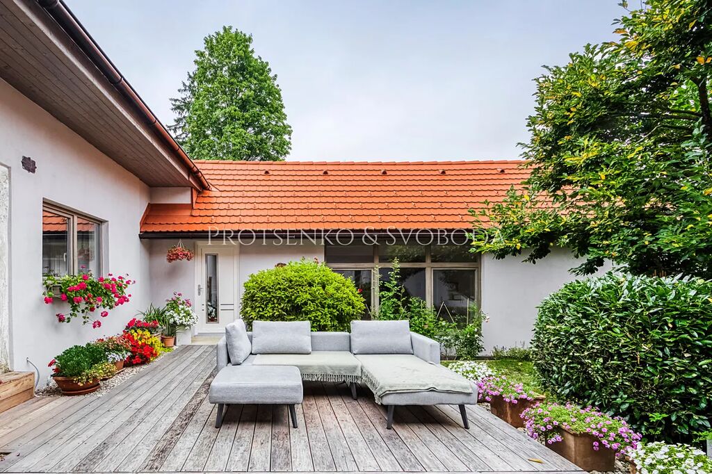 Nejde o obyčejnou stavbu – jsou to dva domy propojené dílnou mezi nimiž se nachází terasa, kde je cítit klid a energie, jako by se tu zastavil čas.