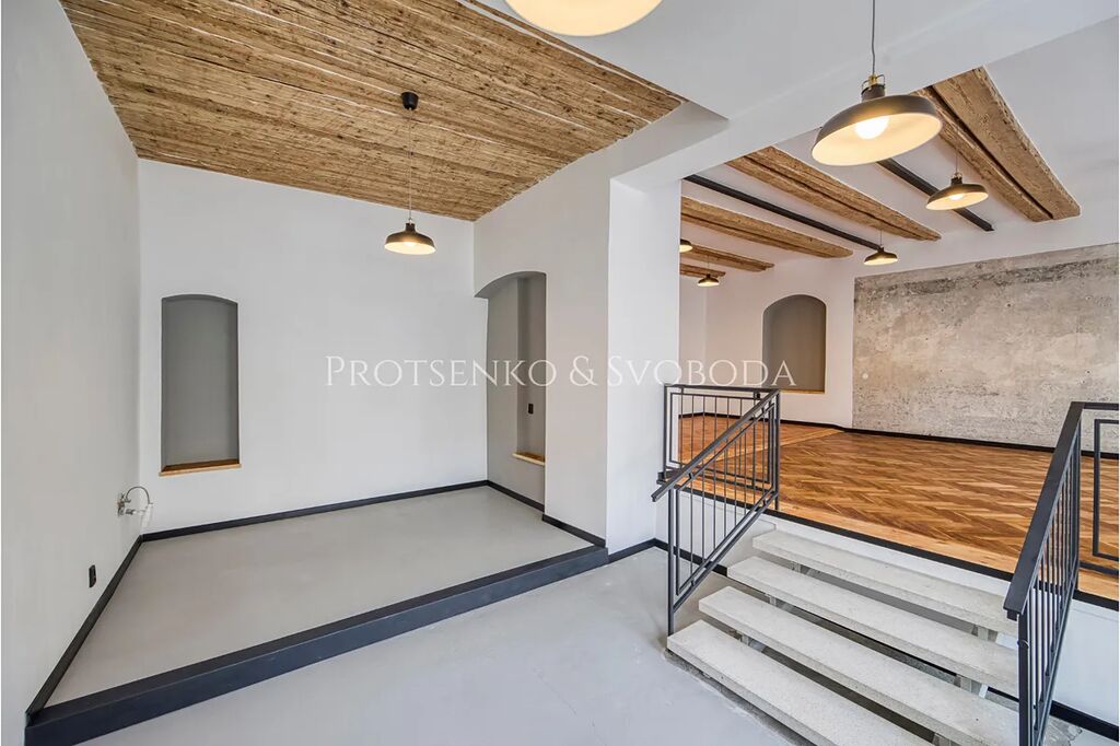 Dispozice nabízí velkorysý otevřený prostor, menší kuchyňku a sociální zázemí. Díky své variabilitě se prostory skvěle hodí pro kanceláře, showroom, designové studio, ateliér, galerii, obchod nebo provozovnu služeb.