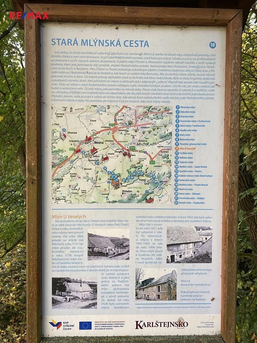 Příjezdová cesta k pozemku ve vlastnictví obce je přímo na turistické trase pokračujícím nádherným údolím Radotínského potoka, kolem původních mlýnů, až do Přírodního parku Radotínsko-Chuchelský háj.