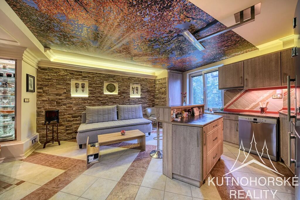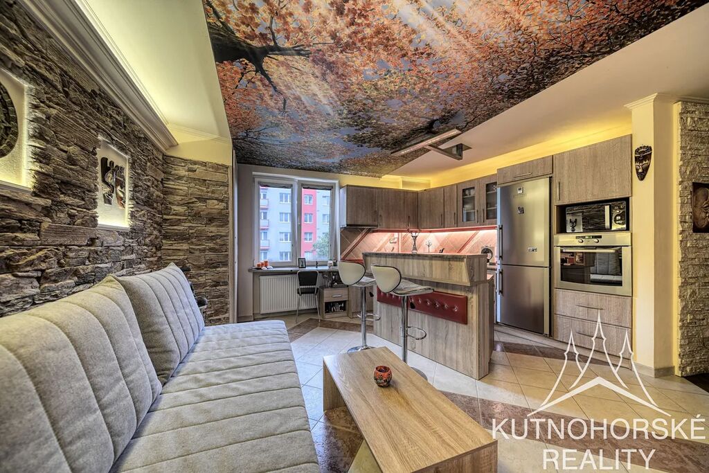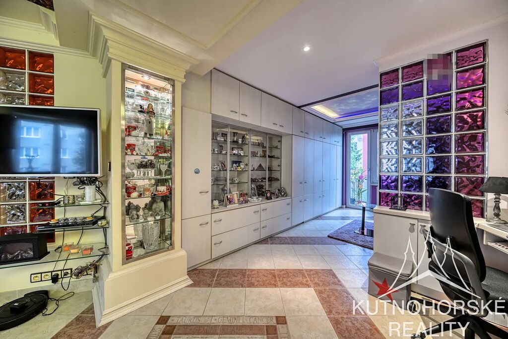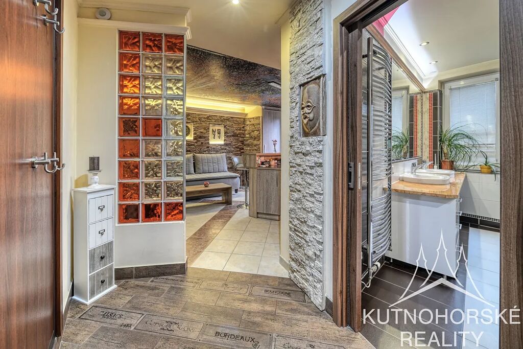 V interiéru byly použity zajímavé prvky – barevné luxfery, kamenné obklady, podsvícení celého prostoru či stropní tapeta v kuchyni (aktuálně motiv listí, lze jednoduše změnit, stáhnutím rolety).