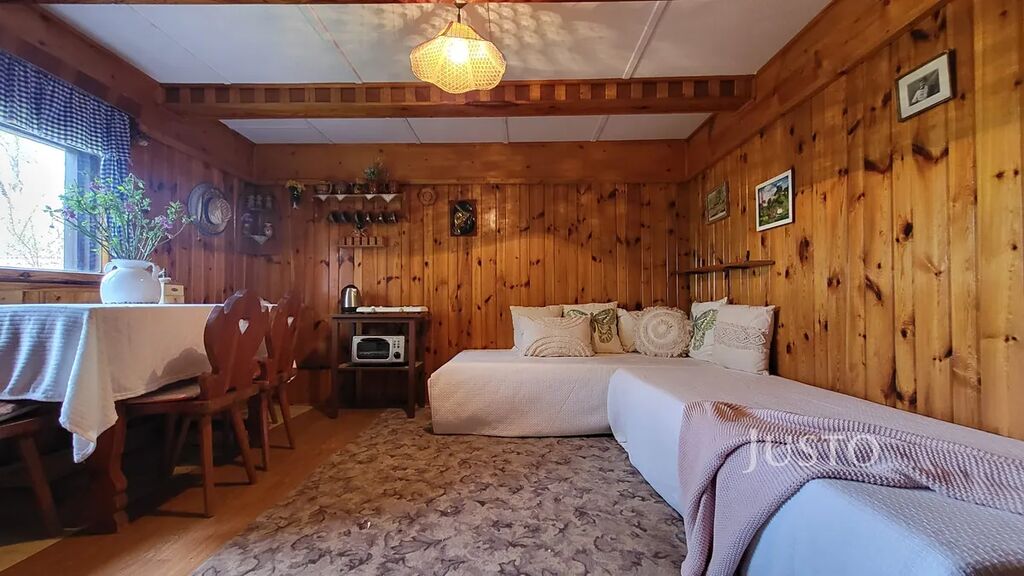 Kolem chaty je terasa s krásným výhledem do krajiny s venkovním posezením.