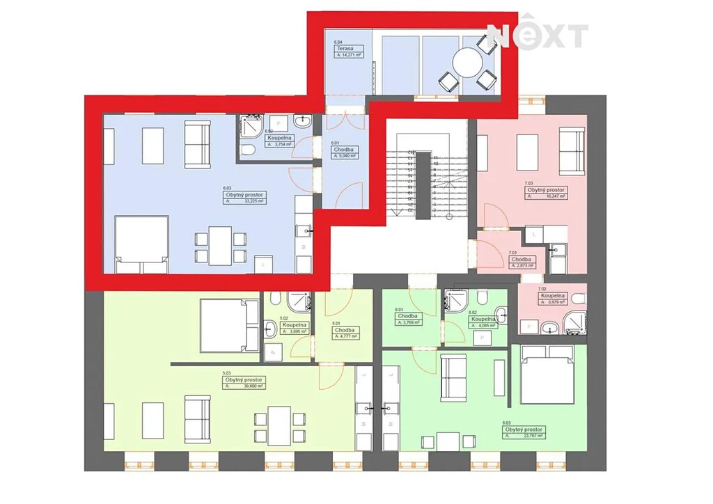 Byt tvoří vstupní chodba o výměře 5,04 m², koupelna s plochou 3,75 m² a prostorný obytný prostor o velikosti 33,23 m², který nabízí dostatek místa pro vytvoření kuchyňského koutu přesně podle vašich představ. Velkou výhodou této jednotky je soukromá terasa o rozloze 14,27 m², která nabízí příjemné místo pro odpočinek, posezení u kávy nebo práci na čerstvém vzduchu.