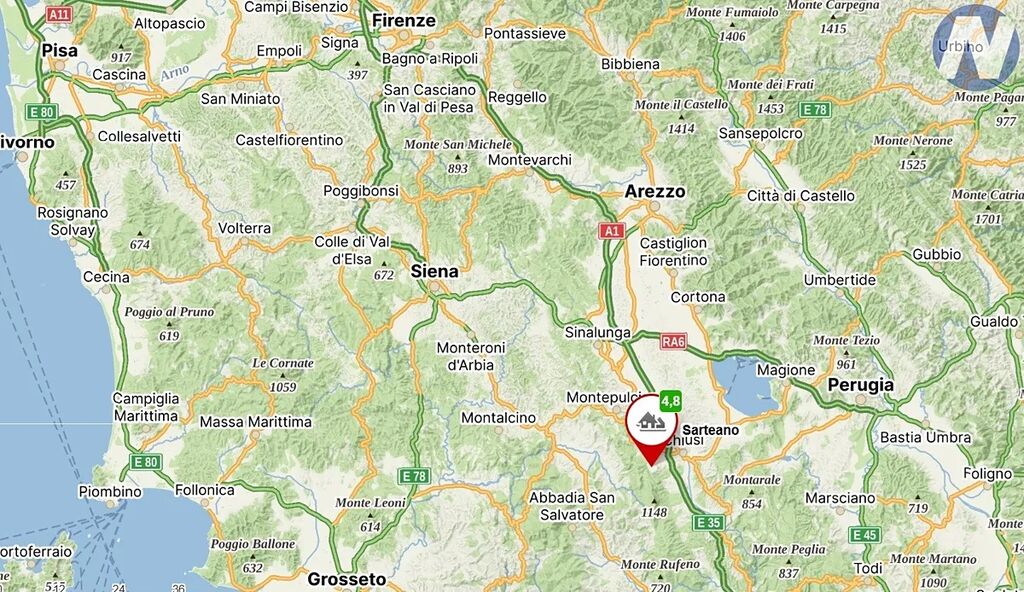 Dům leží v jižní části Toskánska, v krajině plné kontrastů a krásy, mezi Dolní Val di Chiana, úrodnou, rovinatou krajinou plnou slunce a Divokou Val d'Orcia, jež je zapsaná na seznamu UNESCO.
