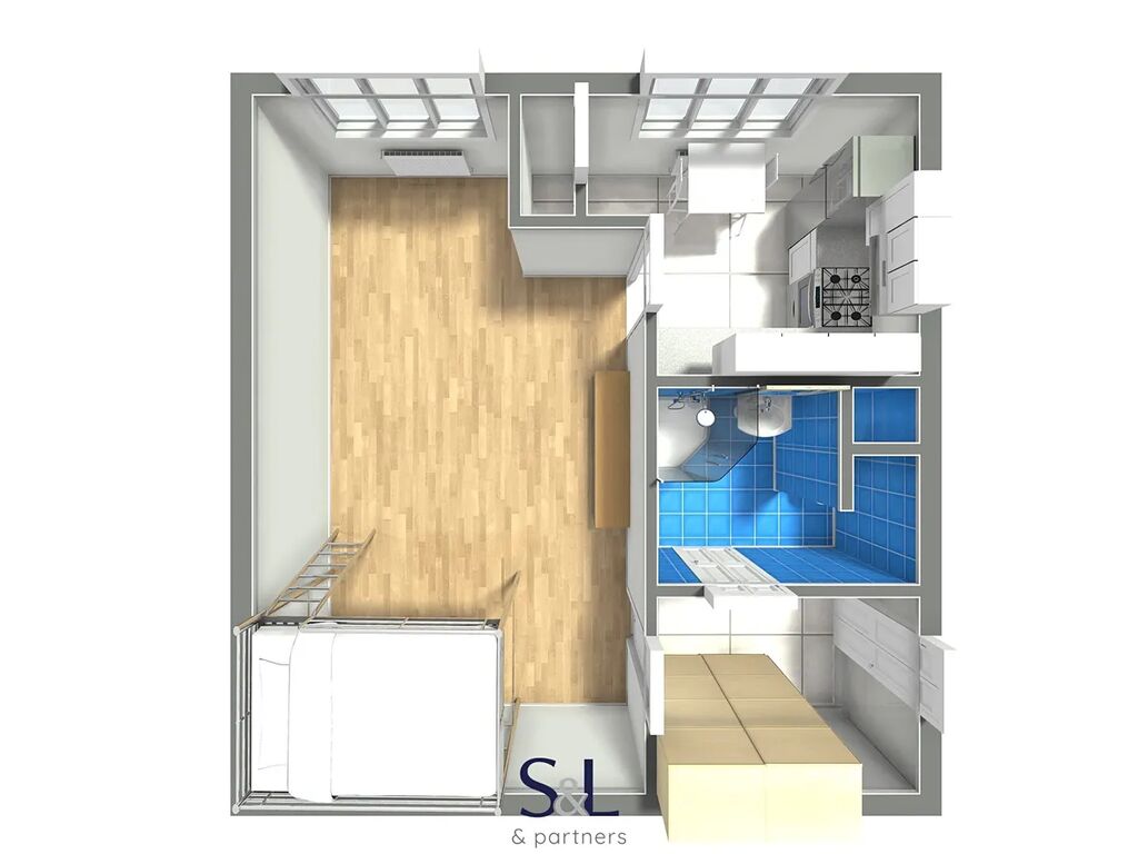 Dispozice bytu je jednoduchá, ale velmi praktická – světlý pokoj lze přizpůsobit jako ložnici s obývacím prostorem, kuchyň nabízí dostatek místa pro jídelní kout i praktickou spíž. V chodbě je prostor pro vestavěnou skříň, koupelna je zděná a vybavená sprchovým koutem a toaletou. K bytu náleží sklepní kóje o velikosti cca 3 m².