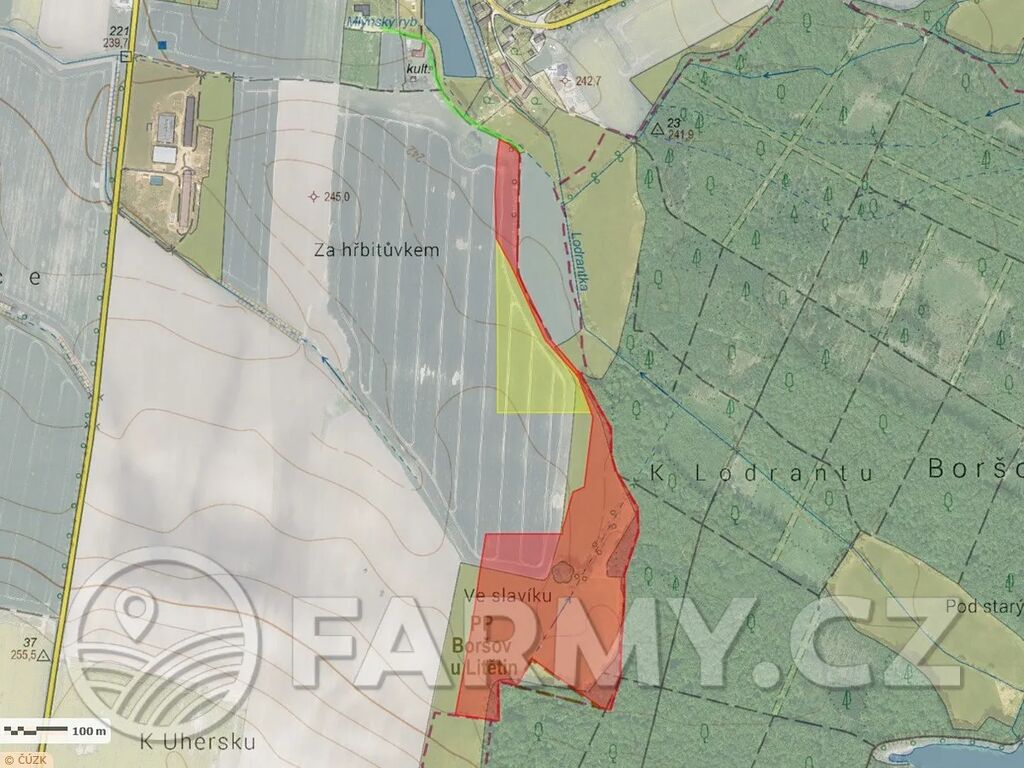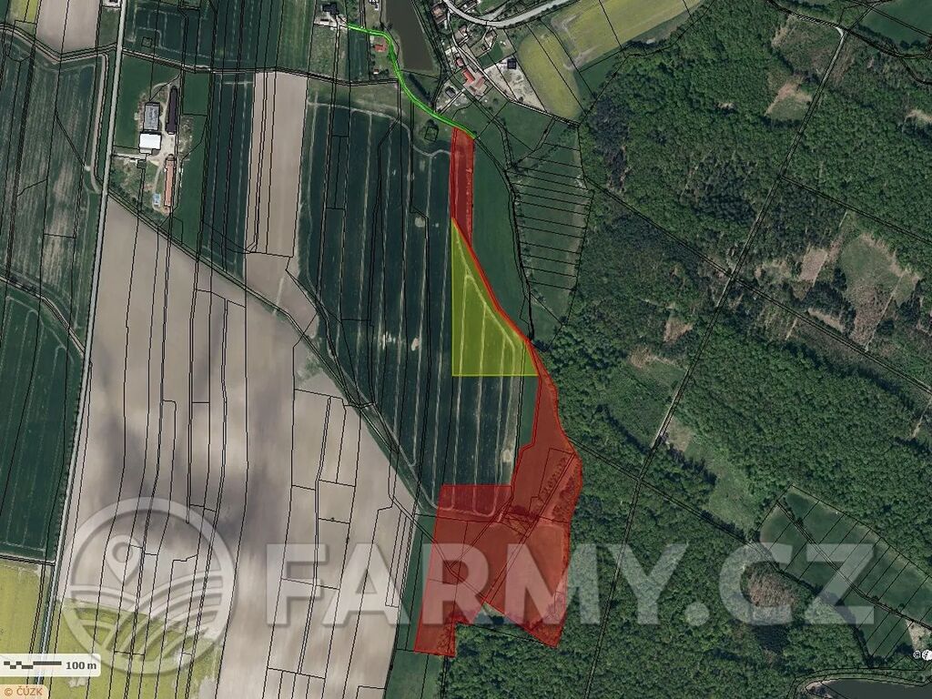 FARMY.CZ exkluzivně nabízí podíly na celistvém souboru pozemků různých velikostí. Konkrétně se jedná o 70% podíl na 8 ha (červená), 30% podíl na 2 ha (žlutá) a 2% podíl na přístupové cestě o výměře 1.582 m2 (zelená).