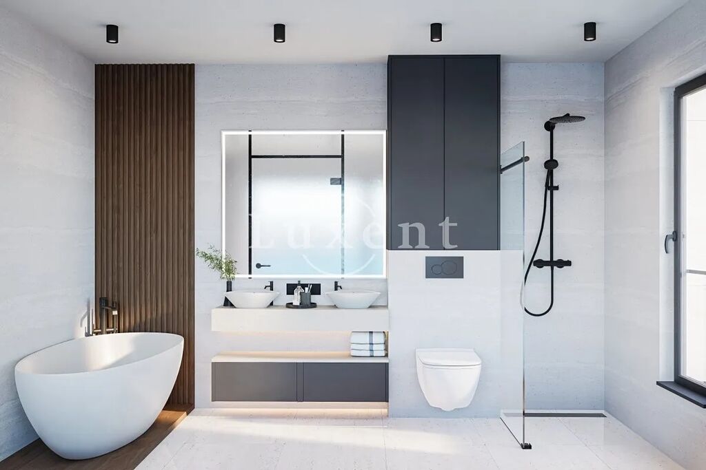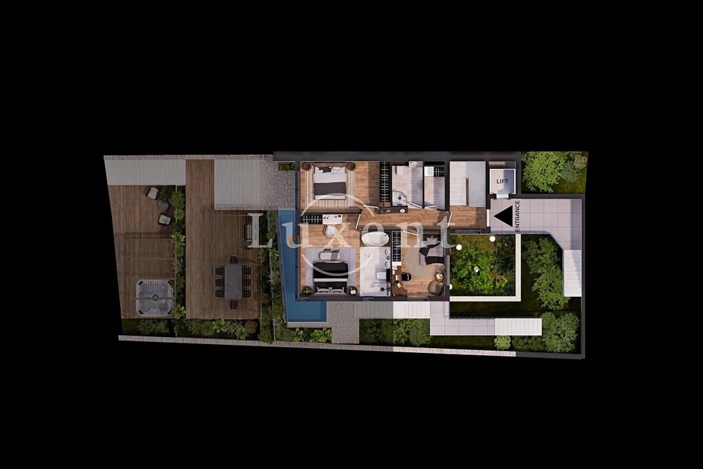 Velkou předností této nemovitosti je rozsáhlý venkovní prostor o velikosti 218,72 m², který poskytuje naprosté soukromí a veškerý komfort rodinného domu. K dispozici jsou kaskádovité terasy se zahradou a soukromým bazénem, přičemž jen pár kroků odtud se nachází upravená pobřežní zóna se sluneční terasou. Obyvatelé mají rovněž přístup do společných prostor – na střešní terasu s posezením a otevřeným výhledem na moře, do fitness zóny a saun v suterénu a také k dalšímu společnému bazénu.