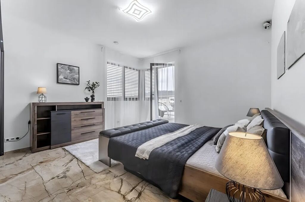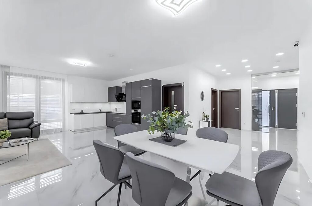 Bezpečnostní vstupní dveře s odemykáním pomocí otisku prstu. Chytrá domácnost ovladatelná mobilem pro osvetlění, podlahové vytápění ve všech místnostech, rekuperace, a špičková bezpečnost zajištěna alarmem a kamerovým systémem . Každý detail byl navržen tak, aby zajišťoval maximální pohodlí a bezstarostný chod domácnosti s nízkými náklady. Nadstandardní koupelny nabizejí italskou dlažbou a prosvětlený interiér díky rohovým oknům.