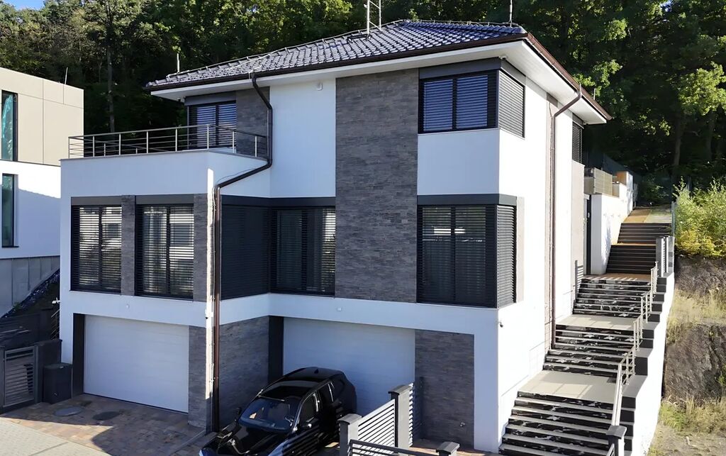 Dvě podlaží a prostorný suterén s garáží o ploše 65 m2 pro dvě auta a dostatkem úložného prostoru . K objektu patří samozřejmě vrt s vodním zdrojem a zároveň napojení na veřejný vodovod. Po boční straně domu, od brány až ke vchodu a dále do zahrady i k lesoparku, vznikla zde elegantní a prostorná schodiště.