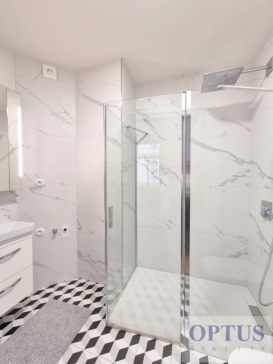 Interiér tvoří prostorný obývací pokoj s moderním kuchyňským koutem, ložnice se vstupem do elegantní koupelny se sprchovým koutem a toaletou.