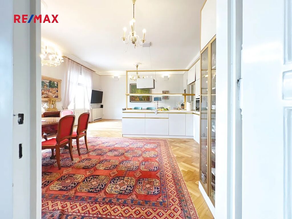 Byt nabízí dostatek úložného prostoru, vestavěné skříně a je připraven k okamžitému užívání. Každý den zde začíná jinak – ale vždy krásně. Obývací pokoj náramně spojuje historický půvab s moderním komfortem.