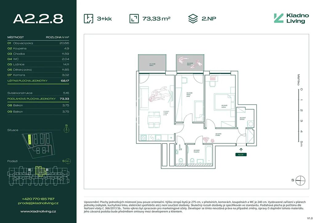 Nabízíme ke koupi moderní byt 3+kk o podlahové ploše 73,3 m² se dvěma balkony 3,75 a 3,75 m² v rezidenčním projektu Kladno Living, který vzniká v jedné z nejatraktivnějších lokalit města Kladno – Kročehlavy. Tento nový developerský projekt představuje jedinečnou příležitost pro ty, kteří hledají nové byty v Kladně nebo investici do nemovitosti s vysokým potenciálem zhodnocení.