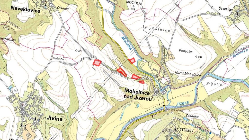 K prodeji je vlastnictví na pozemcích parc. č. 221, 256, 319/2, 319/5, 321 a 401/2 zapsaných na LV 821 v KÚ Mohelnice nad Jizerou.