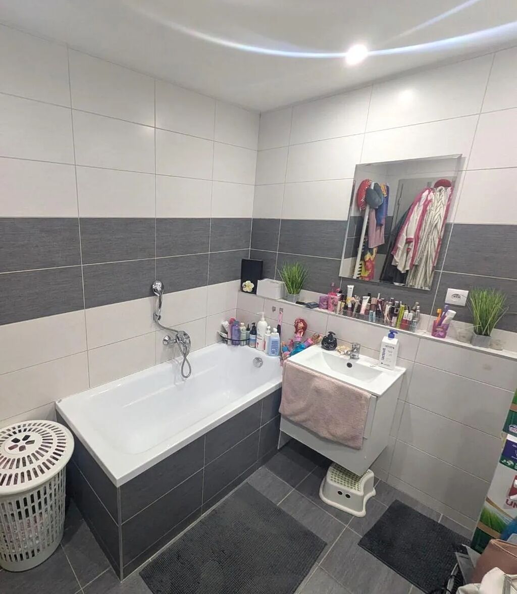 V kuchyni je kuchyňská linka v bílém lesku s vestavěnými spotřebiči a varnou deskou. V koupelně je vana, sprchový kout a WC. Celý interiér je laděný do bílých a šedých odstínů stejně jako plovoucí podlahy a dveře. Koupelna je obložena moderními obklady ve stejných barvách. K bytu náleží kumbál i sklep.