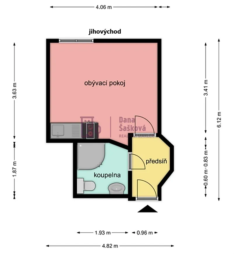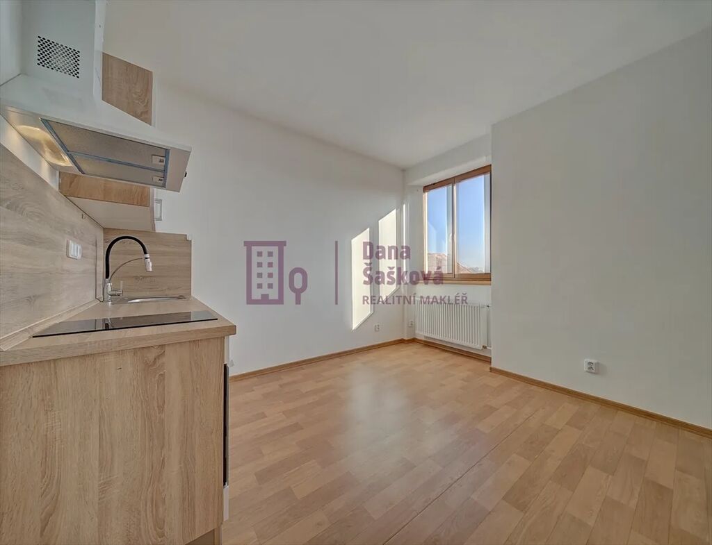 Dispozice 1+kk nabízí pokoj s kuchyňský koutem a koupelnu se sprchovým koutem a toaletou.