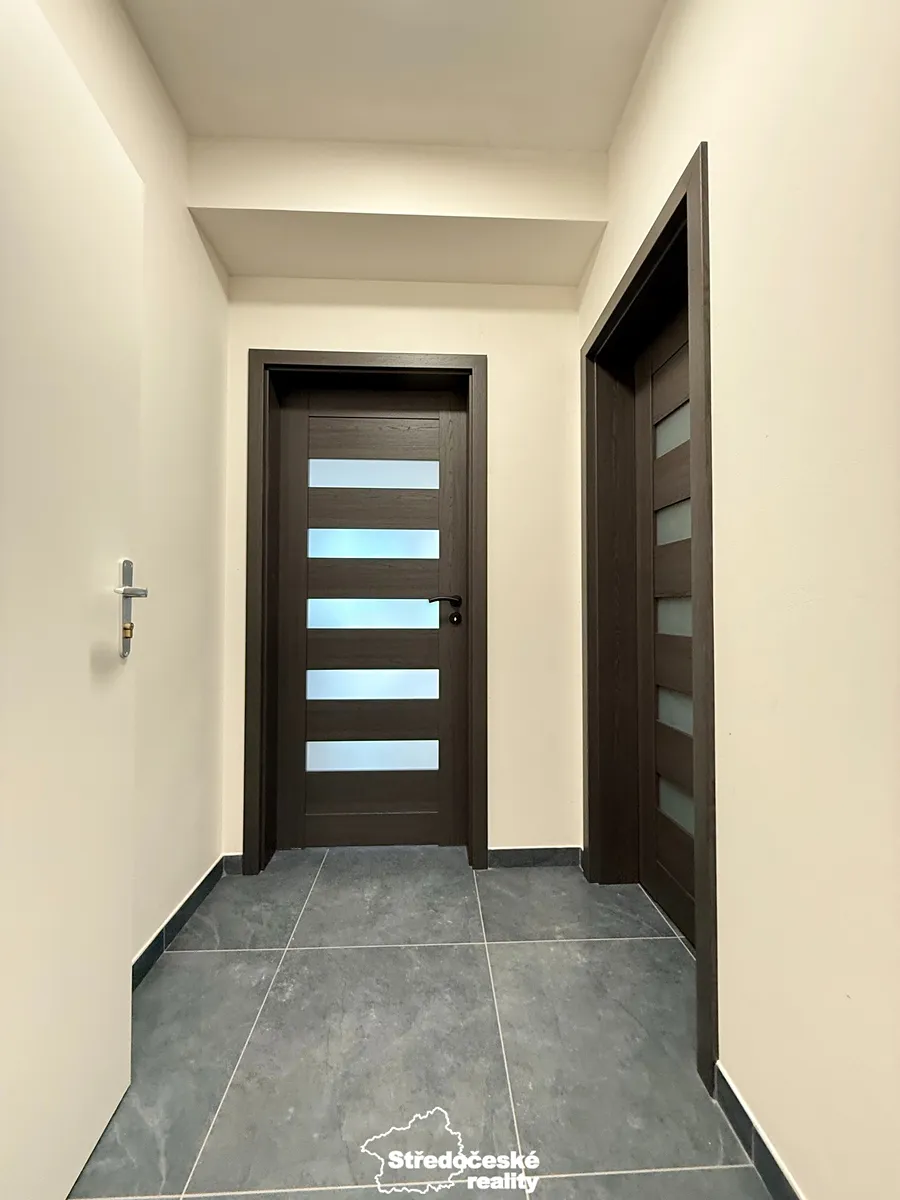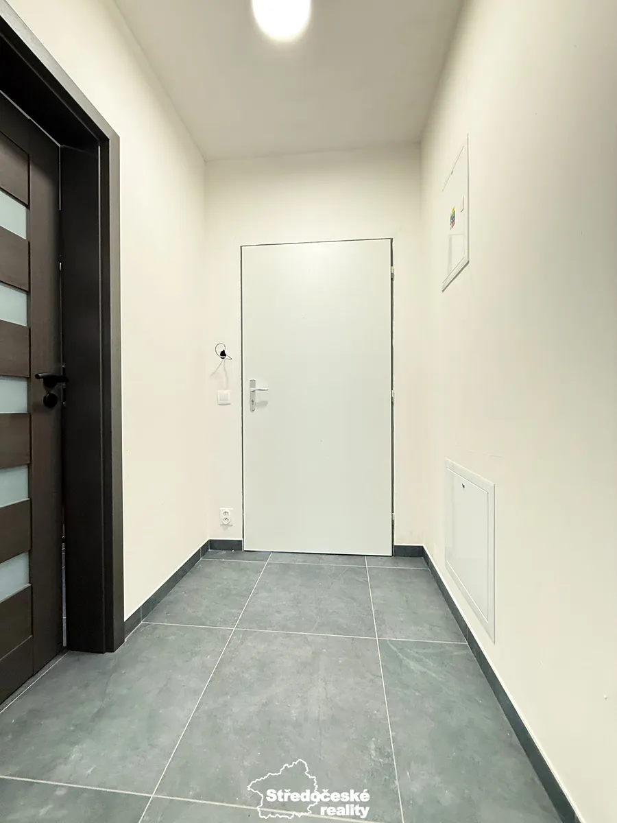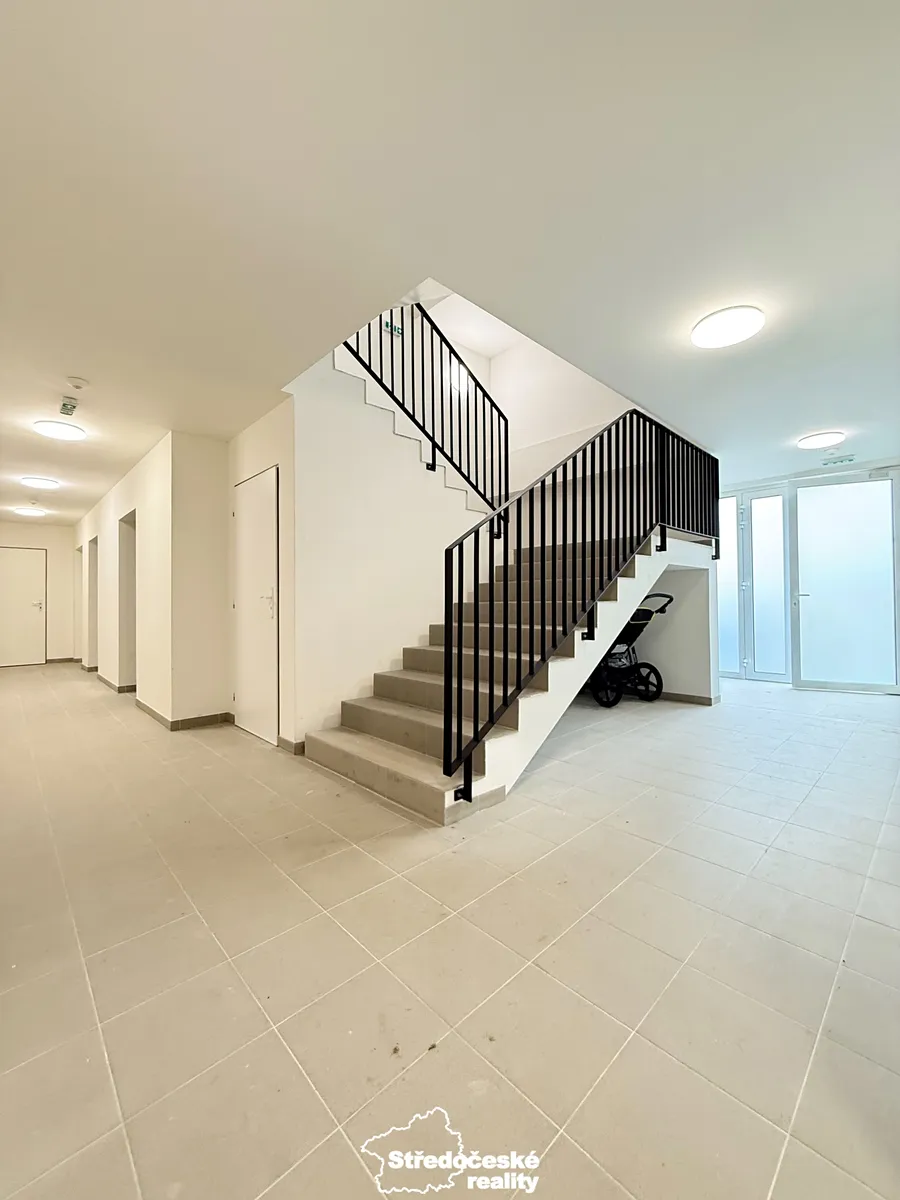 Po vstupu do bytu se nachází chodba. Po pravé straně je koupelna se sprchovým koutem, WC a přípravou pro pračku. Dále následuje obývací pokoj s kuchyňským koutem o výměře 21,2 m², vybavený novou kuchyňskou linkou a základními spotřebiči: myčkou, varnou deskou, vestavěnou elektrickou troubou, digestoří a mikrovlnkou. Z obývací části je přímý vstup na terasu a zahradu (oplocení plánováno na jaro 2026).