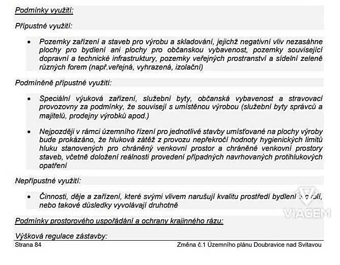 Možnosti využití pozemku jsou dle územního plánu různorodé, především jsou však určeny pro výrobní a skladovací účely.