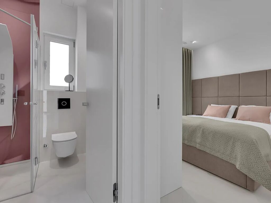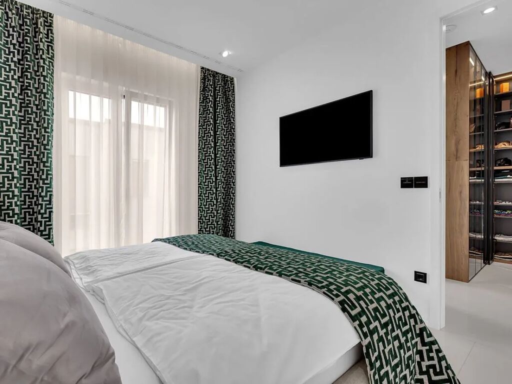 Apartmán sestává z chodby, kde je vestavěná šatní skříň, 2 koupelen, prádelny, 2 ložnic, obývacího pokoje s kuchyní a jídelnou, lodžie a prostorné jižně orientované terasy o ploše 32,52 m2. Apartmán se prodává velmi moderně a vkusně zařízený, čisté linie s bílými akcenty v moderní kuchyni a pokojích dodávají apartmánu otevřený a bezchybný vzhled. Je vybavený klimatizací v každém pokoji, podlahovým vytápěním v koupelnách, má keramické dlaždice, elektrické rolety, bezpečnostní dveře a skleněné zábradlí na terase. Při výstavbě byly použity nejkvalitnější materiály včetně špičkové tepelné a zvukové izolace. V ceně apartmánu jsou 2 garážová parkovací stání v suterénu budovy o celkové ploše 28,73 m2. Vzdálenost od moře je cca 250 m.