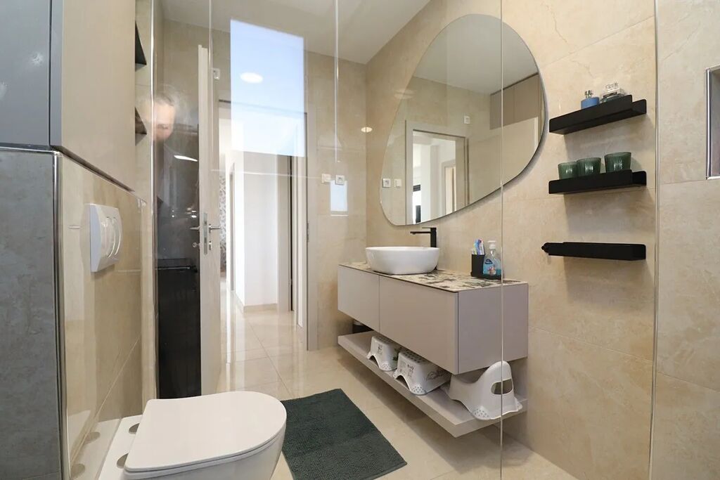 Apartmán o ploše 102,60 m2 je umístěný ve druhém patře moderní bytové budovy a sestává z chodby, dvou ložnic, z nichž jedna má vlastní koupelnu a přístup na terasu, další koupelny, samostatné toalety a prostorného obývacího pokoje s kuchyní a jídelnou, ze kterého je přístup na velkou terasu vybavenou vířivkou. Apartmán je klimatizovaný, v koupelnách je podlahové vytápění, moskytiéry na všech oknech, plně zařízený a veškerý nábytek a vybavení jsou již zahrnuty v ceně. K apartmánu náleží 2 parkovací stání a dvorek o rozloze 44,50 m2 což nemovitosti dodává ještě větší hodnotu.