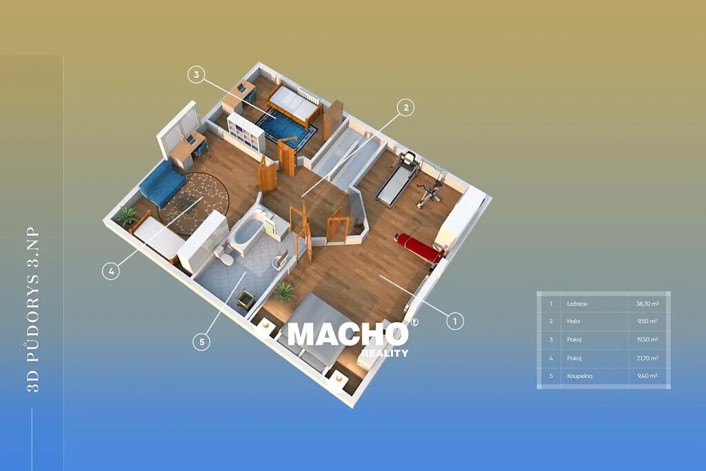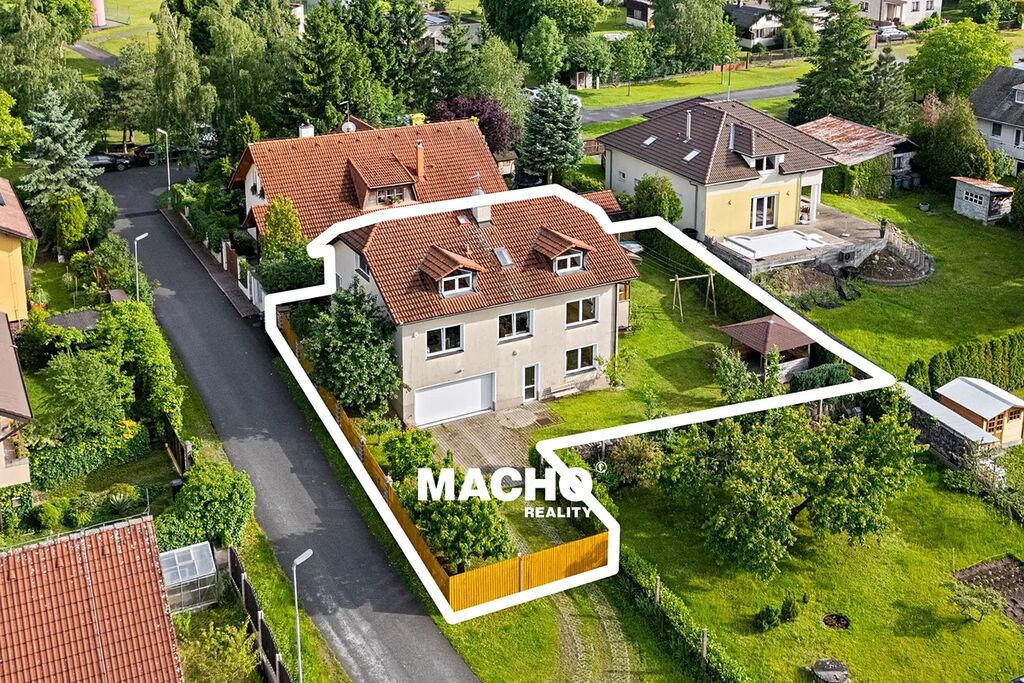 Dům o celkové podlahové ploše vč. příslušenství 333 m², disponuje dvěma bytovými jednotkami na třech podlažích. Je tak vhodný i pro vícegenerační bydlení. V 1. NP je samostatným bezbariérovým vstupem přístupná garsoniéra s kuchyňským koutem a koupelnou s vanou a toaletou. Dále se na podlaží nachází garáž pro tři vozy, technická místnost a z venku přístupný sklep. 2. NP zahrnuje předsíň, prostorný pokoj s krbovými kamny, obývací pokoj s kuchyňským koutem a přímým vstupem do zimní zahrady, velkou šatnu a koupelnu s rohovou vanou, sprchovým koutem, toaletou a bidetem. 3. NP nabízí ložnici, dva pokoje a koupelnu s vanou a toaletou.
