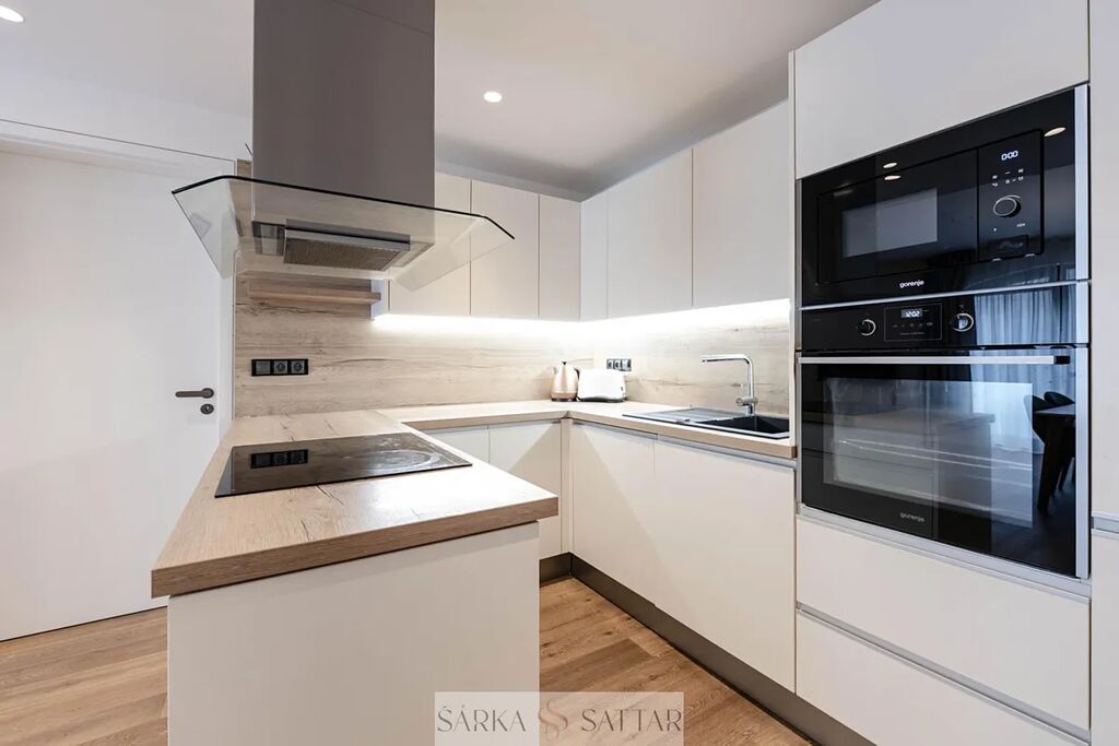 - kuchyňský kout plně vybavený : indukční varná deska, digestoř, el. trouba, mikrovlnná trouba, lednice, mrazák
