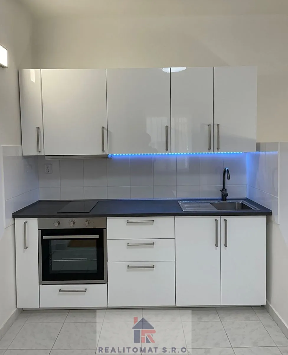 V přízemí se nachází světlá místnost o velikosti 17 m², která nyní slouží jako kuchyň s obývacím pokojem. Je vybavena novou kuchyňskou linkou IKEA se sklokeramickou deskou a troubou.