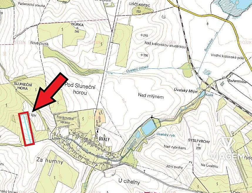Pozemek se nachází nedaleko rodinných domů a je přístupný cestou, která vede kolem parcely.