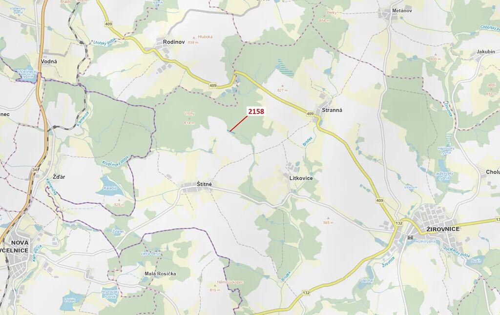 Lesní pozemek o výměře 2356 m2, parcelní číslo 2158, podíl 1/1, katastrální území Štítné, obec Žirovnice, obec s rozšířenou působností Pelhřimov, okres Pelhřimov, Kraj Vysočina. Po těžbě.
