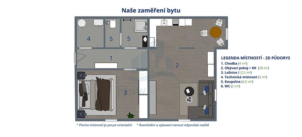 Jsme v 2. nadzemním podlaží z celkových 2. NP cihlového domu. Byt se skládá z obývacího pokoje a kuchyňského koutu, dále pak z ložnice, chodby, koupelny, samostatného WC a tajné technické místnosti!