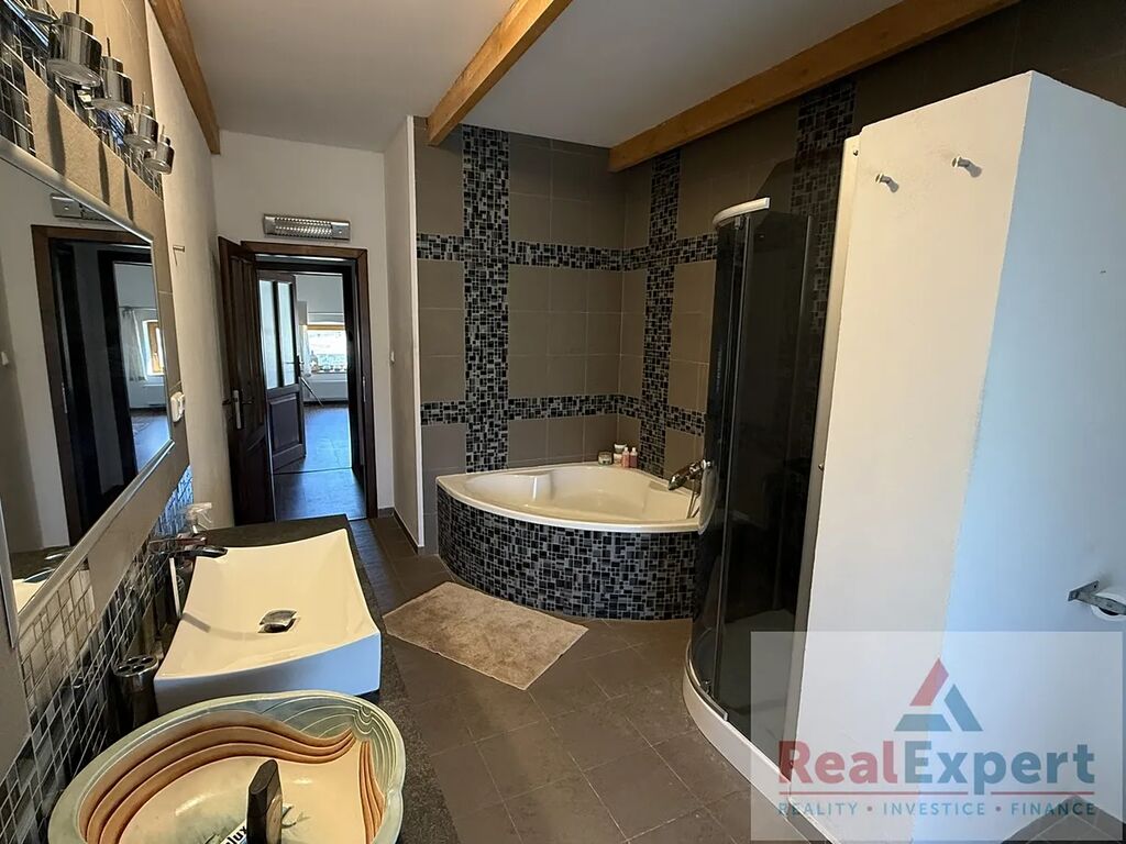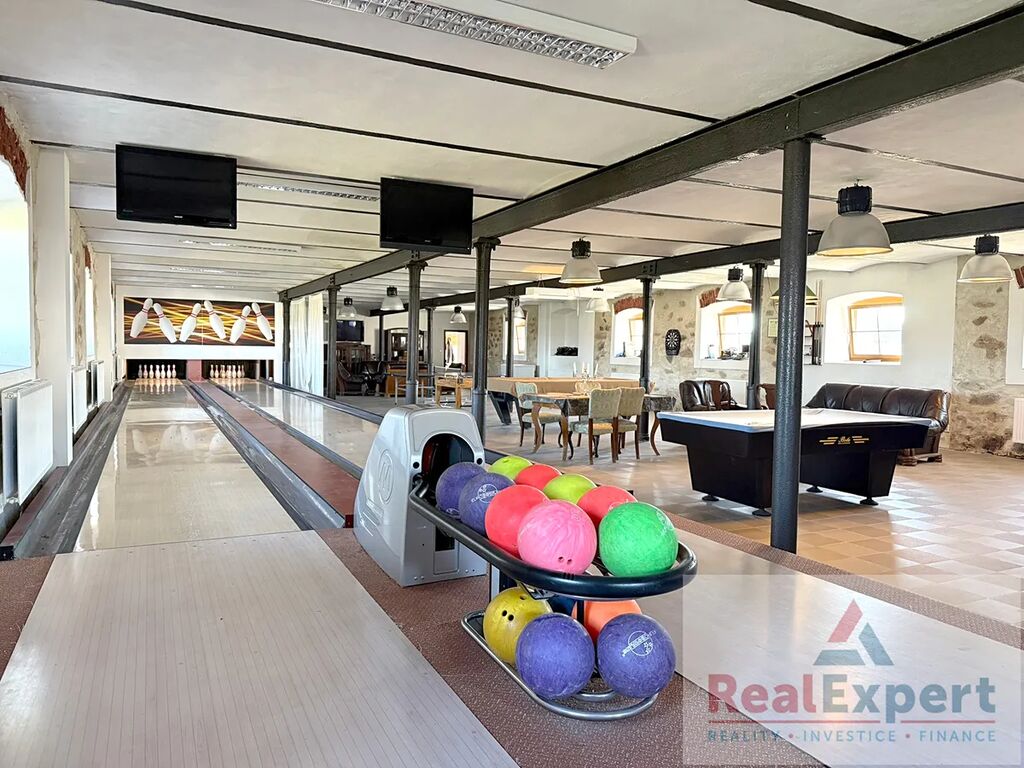 Hlavní patrová budova (62 × 15 m, zastavěná plocha 930 m², užitná plocha cca 1 480 m²) nabízí v přízemí reprezentativní společenské prostory: relaxační místnost (177 m²) s bazénem a saunou, společenský sál s barem a bowlingem (278 m²), keramickou dílnu a vstupní halu. V patře jsou čtyři kompletně vybavené apartmány (3× 3+kk, 1× 4+kk) – každý s vlastní koupelnou, WC, kuchyní a obývacím pokojem. Veškeré vybavení je součástí prodeje.