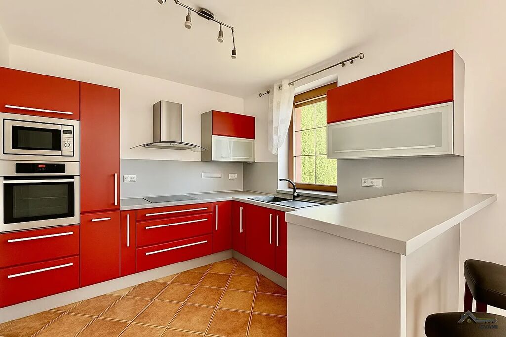 Zánovní kuchyň se spotřebiči navazující na jídelnu a vstupem na terasu