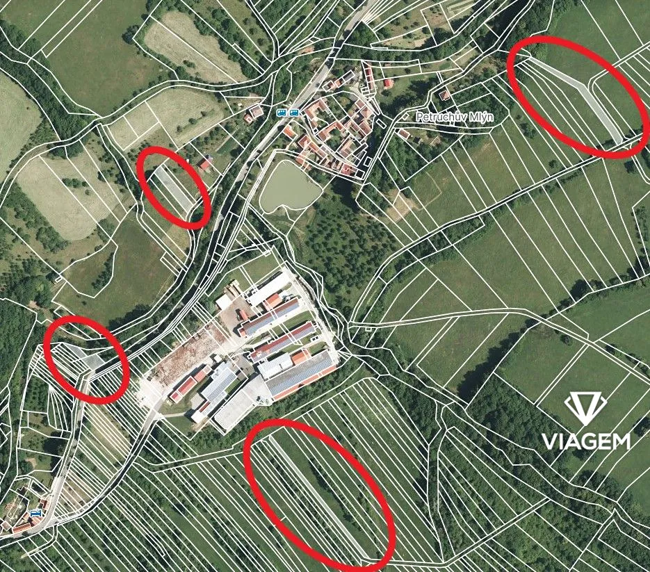 •	Parcelní čísla a výměry: 887/1 – 170 m², 887/2 – 279 m², 7482 – 623 m², 8376 – 704 m², 8543 – 1 002 m²