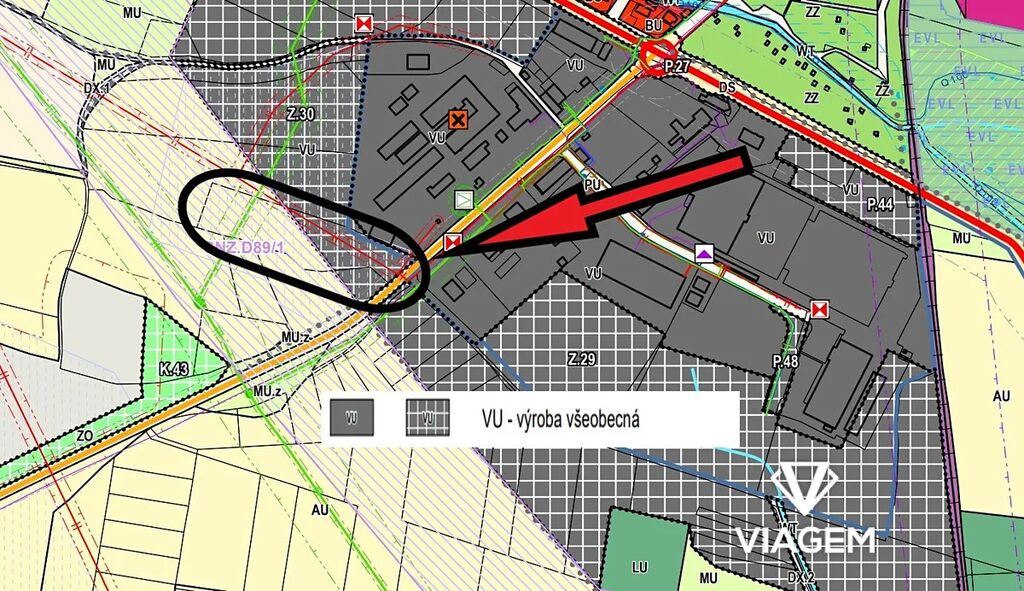 Dle územního plánu je část pozemku určena jako plocha výroby a skladování (VU), což umožňuje využití pro lehkou průmyslovou výrobu, sklady či logistiku. Zbývající část se nachází v koridoru plánované dopravní komunikace, což představuje strategickou výhodu do budoucna a potenciál výrazného zhodnocení.