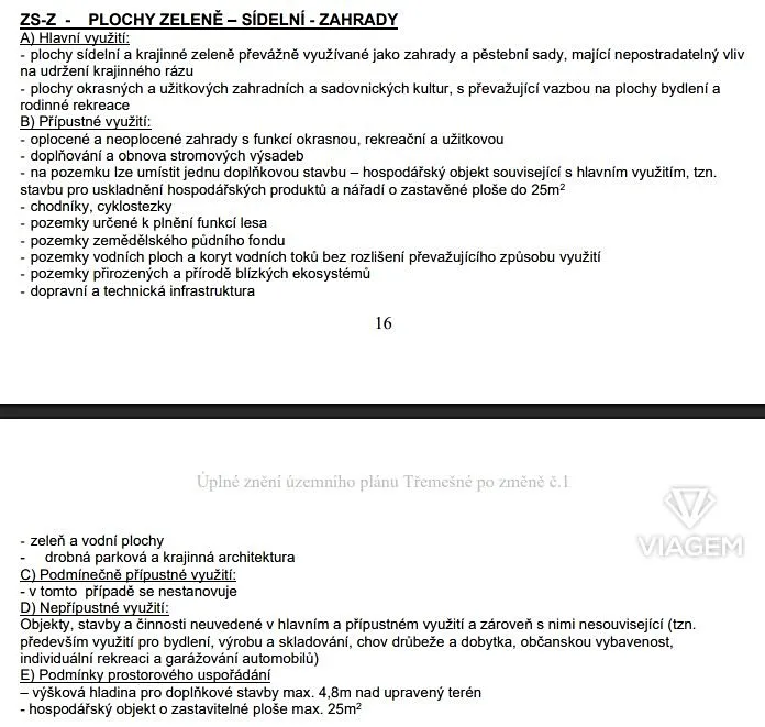 Dle platného územního plánu je pozemek zařazen do ploch ZS-Z – plochy zeleně sídelní – zahrady. To znamená, že jej lze využít nejen k rekreačním a pěstitelským účelům, ale také je zde možné umístit menší doplňkovou stavbu do 25 m² (např. zahradní domek nebo kůlnu na nářadí). Povolená výška takové stavby může být až 4,8 m nad upravený terén.
